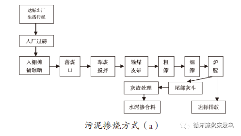 方式(a):生活污泥經(jīng)污水處理廠脫水后運送至公司現(xiàn)場進行攤鋪晾曬,然后經(jīng)輸煤系統(tǒng)與原煤混合入爐充分燃燒,從而達到資源化處理的效果,有效利用垃圾、污泥中的剩余熱值,減少原生垃圾及污泥因填埋對環(huán)境造成的持續(xù)污染問題。其污泥摻燒方式如圖1(a)所示。