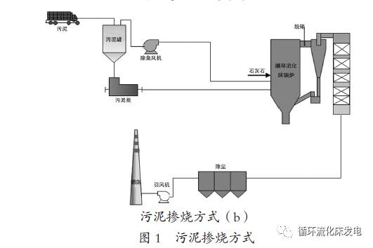 方式(b):生活污泥經(jīng)污水處理廠脫水后運送至公司污泥罐,污泥罐下部布置污泥泵(柱塞泵)。污泥直接通過污泥泵輸送至爐膛進行燃燒處理。污泥給入口布置播料風,同時布置插板閥以防止污泥系統(tǒng)停運時煙氣反竄。污泥罐上部布置除臭風機,將罐內(nèi)揮發(fā)氣體送至爐膛進行燃燒凈化。其污泥摻燒方式如圖1(b)所示。