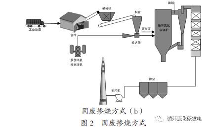 方式(b):使用氣力輸送系統(tǒng)將破碎后的固廢輸送至爐膛進行燃燒利用。其固廢摻燒方式如圖2(b)所示。