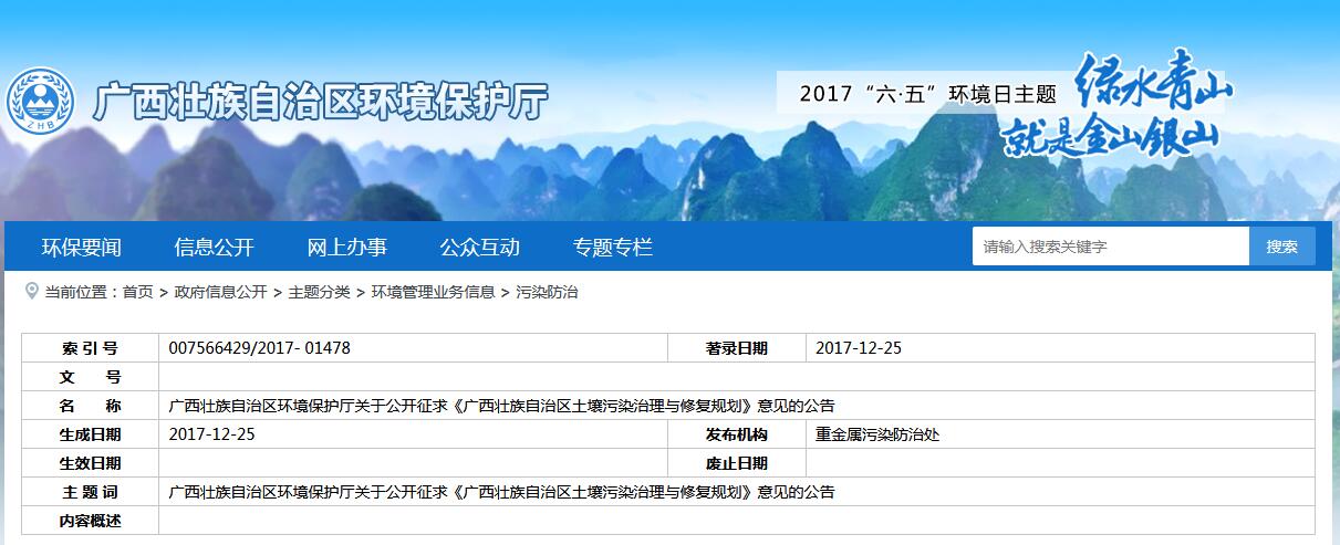 廣西壯族自治區(qū)環(huán)境保護(hù)廳關(guān)于公開征求《廣西壯族自治區(qū)土壤污染治理與修復(fù)規(guī)劃》意見的公告