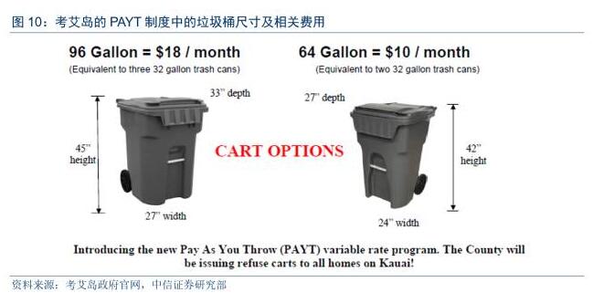 PAYT制度通常下的定價模式有全單位定價模式、部分單位定價及浮動定價等三種模式。以全單位定價的PAYT模式為例,居民首先需要購買由當?shù)卣y(tǒng)一印刷的標牌,并將標牌粘貼到一定容量的垃圾袋上;或者根據(jù)自己產(chǎn)生垃圾量大小向政府申請垃圾桶,政府根據(jù)垃圾桶大小而收費。以夏威夷州的考艾島為例,該地區(qū)在2015年7月開始實行PAYT制度,居民可以選擇兩種尺寸的垃圾桶,一種是96加侖的垃圾桶,每月需付費18美元,一種是64加侖的垃圾桶,每月需付費10美元,一個64加侖的車,每月10美元。