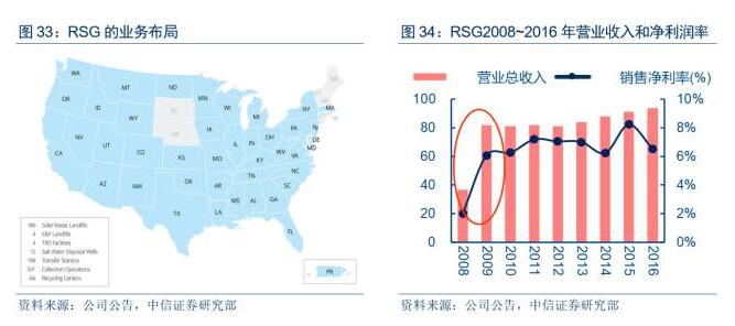 根據(jù)收入規(guī)模計算,共和服務(RSG)是美國第二大固廢公司,業(yè)務基本覆蓋美國全境。截至2016年底,RSG在美國39個州經(jīng)營333個收集點,204個轉(zhuǎn)移站,192個活性填埋場,64個回收中心,7個回收和處置設施以及10個鹽水處理井,71個氣體填埋和可再生能源項目。2016年公司實現(xiàn)營業(yè)收入93.88億美元,凈利潤2.47億美元。