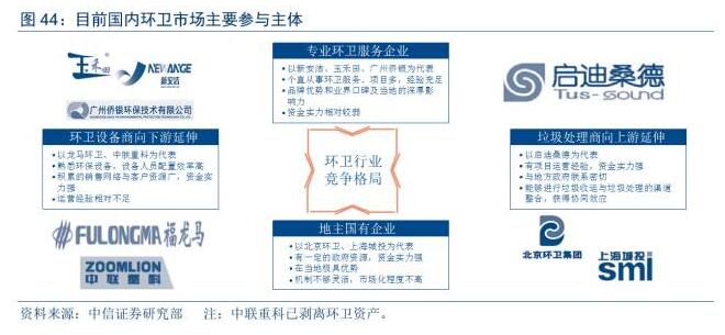 區(qū)域性國企公司:政府資源密切,主要依托當?shù)卣P系開展業(yè)務,在當?shù)丨h(huán)衛(wèi)市場中占據(jù)主導地位,但市場化程度、管理效率和跨區(qū)域運營能力等方面能力偏弱。不過,部分在機制及活力等方面表現(xiàn)突出的區(qū)域性國企未來進一步成長潛力也比較充沛,以北京市國資委下屬的北京環(huán)衛(wèi)等為典型代表。