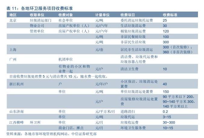 而對于垃圾清運項目,部分地區(qū)沒有對此項進行相關收費規(guī)定,而僅針對從市政垃圾轉(zhuǎn)運站到后續(xù)處理的過程收取垃圾處理費。根據(jù)收費對象不同以及是否為生活垃圾,收費標準也有所不同。以北京市為例,其收取生活垃圾清運費標準為30元/戶/年,遠遠低于垃圾清運75元/噸的市場價格,多余部分主要靠財政補貼為主;而且垃圾清運費的收取存在難度,廣州因為多戶欠繳費用,考慮試行隨水費一起征收的辦法來提高繳費居民比例,差額部分仍需政府財政投入來保證環(huán)衛(wèi)服務項目正常運轉(zhuǎn)。