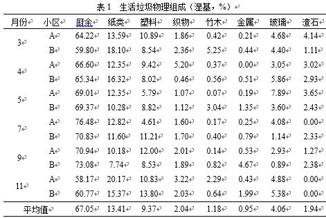 生活垃圾的物理組成與多種因素有關(guān),不同產(chǎn)生源的生活垃圾物理組成差異較大。表1列出了試點(diǎn)小區(qū)生活垃圾的物理組成,廚余垃圾的含量顯著高于其他成分,且5~9月的比例更高。四分類推廣過程中,有害垃圾的分類效果最好,可回收物分離效果最差。紙盒、塑料包裝和玻璃瓶混在生活垃圾中,被廚余垃圾污染,回收難度加大。試點(diǎn)初期居民將廚房垃圾與廚余垃圾混淆,用過的餐巾紙和食品外包裝等大量進(jìn)入廚余垃圾桶,三個月后,廚余垃圾桶內(nèi)廚余垃圾比例達(dá)到90%以上,滿足生物處理的需要。