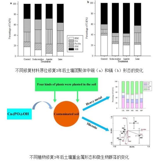 在不同修復(fù)材料同種修復(fù)植物試驗(yàn)中,向土壤中施加含微米羥基磷灰石修復(fù)材料、堿渣、石灰等不同修復(fù)材料,種植海州香薷作為修復(fù)植物,土壤和土壤團(tuán)聚體中鎘和銅的生物可利用態(tài)含量均顯著降低,且這3種修復(fù)材料均能顯著增加土壤干、濕團(tuán)聚體的穩(wěn)定性;在土壤團(tuán)聚體重金屬鎘、銅總量分布中,粒徑<0.053mm的團(tuán)聚體銅和鎘濃度最高,在0.053-0.25mm和0.25-2mm的土壤團(tuán)聚體中銅和鎘的質(zhì)量負(fù)載量最高。材料修復(fù)土壤中的銅、鎘形態(tài)變化是因?yàn)橹亟饘冁k、銅離子由可交換態(tài)轉(zhuǎn)化為穩(wěn)定態(tài)。試驗(yàn)中發(fā)現(xiàn)土壤團(tuán)聚體中的重金屬含量與團(tuán)聚體的粒徑相關(guān),也與土壤團(tuán)聚體中的有機(jī)碳顯著相關(guān)。