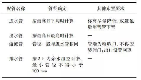 1、調(diào)蓄與管配廠區(qū)所有清水池調(diào)蓄容積之和應(yīng)根據(jù)式(1)及式(2)確定。下疊清水池各管配件布置原則與傳統(tǒng)清水池相同,應(yīng)根據(jù)手冊(cè)上要求按表1配套設(shè)計(jì)進(jìn)水管、出水管、溢流管和排水管等管配件。