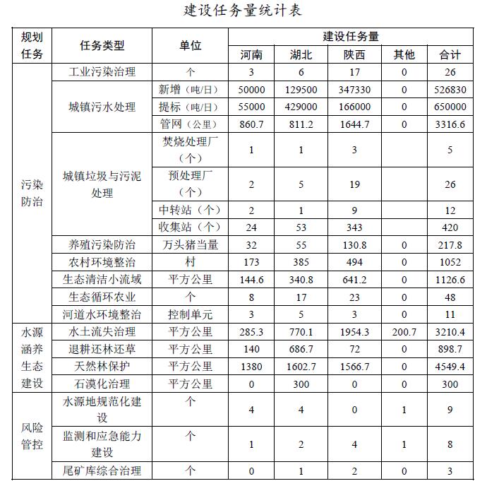 圍繞規(guī)劃目標(biāo),規(guī)劃實(shí)施污染防治、水源涵養(yǎng)與生態(tài)建設(shè)、風(fēng)險(xiǎn)管控3大類建設(shè)任務(wù),估算總投資196億元。其中:工業(yè)污染防治項(xiàng)目26項(xiàng),估算投資6.00億元;城鎮(zhèn)污水處理新增污水處理能力526830噸/日,新增管網(wǎng)3317公里,提標(biāo)改造能力650000噸/日,估算投資43.17億元;垃圾和污泥采取收集、預(yù)處理、轉(zhuǎn)運(yùn)、焚燒進(jìn)行綜合處理,新增垃圾和污泥處理處置能力8000噸/日,估算投資35.62億元;養(yǎng)殖污染防治新增217.8萬頭豬當(dāng)量治理能力,估算投資10.94億元;農(nóng)村環(huán)境綜合整治新增建制村1052個(gè),估算投資15.76億元;生態(tài)清潔小流域治理面積1126.6平方公里,估算投資11.27億元;生態(tài)循環(huán)農(nóng)業(yè)與面源污染綜合治理試點(diǎn)48個(gè),估算投資14.50億元;河道綜合整治(含人工濕地)11個(gè)控制單元,估算投資5.25億元;綜合治理水土流失面積3210平方公里,估算投資25.68億元;退耕還林還草和石漠化治理、天然林保護(hù)工程,估算投資16.4億元;水源地規(guī)范化建設(shè)項(xiàng)目9個(gè),估算投資5.93億元;監(jiān)測(cè)和應(yīng)急能力建設(shè)項(xiàng)目8個(gè),估算投資1.14億元;尾礦庫(kù)綜合治理3個(gè),估算投資4.35億元。