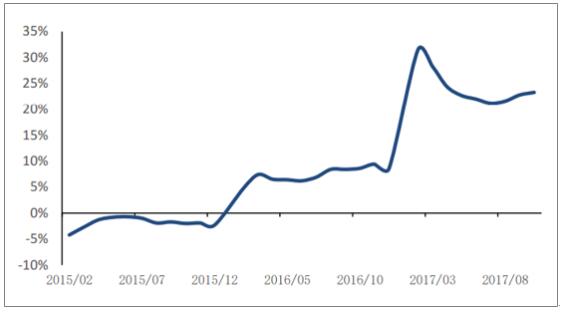 工業(yè)企業(yè)利潤總額同比增速自2016年開始好轉(zhuǎn),2017年以來顯著提升