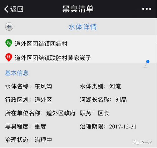 不過(guò),2018年1月8日,環(huán)保部“城市水環(huán)境公眾參與”的微信公眾號(hào)顯示,東風(fēng)溝的治理狀態(tài)仍為”治理中”。