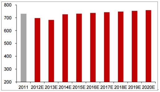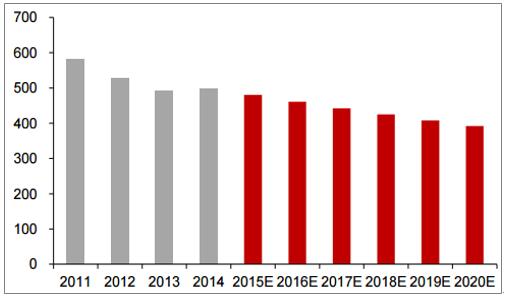 由于環(huán)保政策的更新和更加嚴格,2011年全國工業(yè)污水處理費用為1.26元/噸,根據我們預測2020年單位工業(yè)污水處理費用將達到1.94元/噸。2011年全國污水處理總量為580億噸,2011年至2014年全國工業(yè)污水總處理量成持續(xù)下降趨勢,CAGR為-3.97%。以此趨勢,我們估計2020年全國工業(yè)污水處理總量將減少至391億噸,屆時全國工業(yè)污水處理市場將達到759億元規(guī)模,由于處理成本增速大于工業(yè)污水處理總量的降幅,行業(yè)總體呈現逐年平穩(wěn)增加趨勢。
