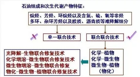石油是烷烴、芳烴、環(huán)烷烴及含氮、硫、氧等非烴類組分的混合物,其中多環(huán)、雜環(huán)芳烴以及膠質(zhì)、瀝青質(zhì)等組分生物降解性較差。石油及次生代謝產(chǎn)的組成特征決定了修復(fù)的難度和復(fù)雜性。因此,單一聯(lián)合技術(shù)不能很好的解決污染問題時(shí),需要考慮聯(lián)合使用各種處理技術(shù)。