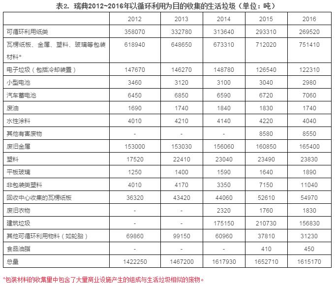 2016年時(shí),瑞典總共循環(huán)利用了161.517萬噸的生活垃圾,相當(dāng)于每人每年162千克,與2015年相比減少了2.3%,減少的主要原因?yàn)榻ㄖ臏p少,包括屋面瓦、纖維玻璃、破損的陶瓷器等。上述對(duì)以循環(huán)利用為目的進(jìn)行的收集量統(tǒng)計(jì),包括居民向生產(chǎn)商建立的循環(huán)利用系統(tǒng)投放的包裝和可循環(huán)利用的紙制品。這一部+
