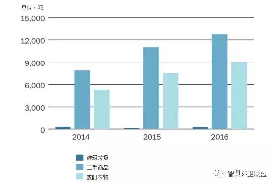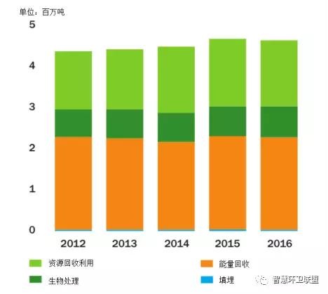 *圖表中以各種處置方法為目的進(jìn)行的收集量與各種方法的實(shí)際處置量間存在一定的差別。對(duì)資源回收利用和厭氧消化來說,收集量和處置量存在差別的原因是,一部分廢物在達(dá)到處理階段后被發(fā)現(xiàn)不符合處理的要求,通常都會(huì)在焚燒廠接受能量回收處理,因此也是能量回收的處理量稍稍高于以此為目的的收集量的原因。建筑垃圾資源回收的實(shí)際處理量要高于收集量,原因是焚燒廠產(chǎn)生的金屬和底灰會(huì)在分類后,得到循環(huán)利用。近年來,實(shí)際接受填埋處理的廢物量要原告于以填埋為目的而進(jìn)行收集的量,主要原因之一是焚燒廠能量回收會(huì)產(chǎn)生大量飛灰,只能接受填埋處置。