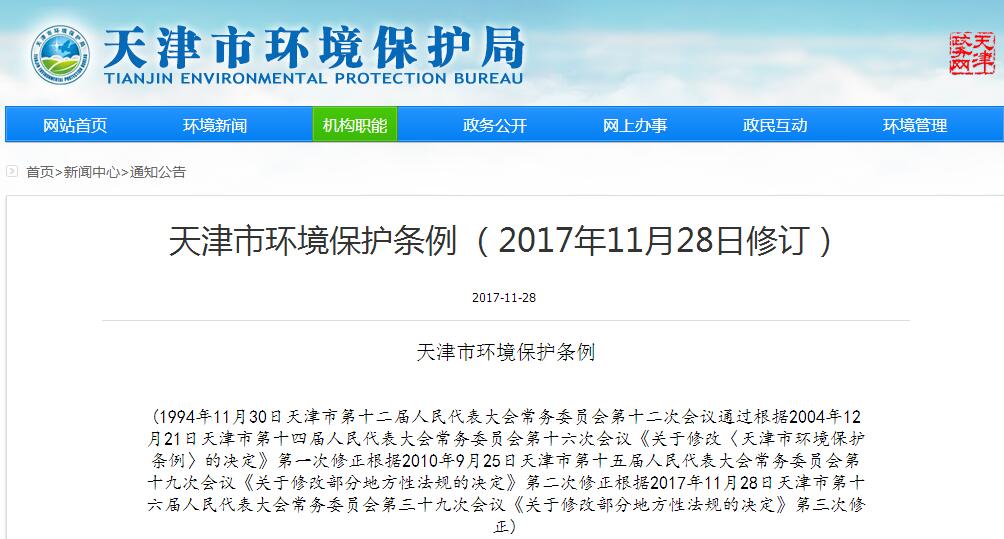 根據(jù)2017年11月28日天津市第十六屆人民代表大會(huì)常務(wù)委員會(huì)第三十九次會(huì)議《關(guān)于修改部分地方性法規(guī)的決定》對(duì)《天津市環(huán)境保護(hù)條例進(jìn)行第三次修正,以切實(shí)保護(hù)和改善天津市的生活環(huán)境與生態(tài)環(huán)境,污染防治和其他公害,保障人民群眾身體健康,促進(jìn)社會(huì)主義現(xiàn)代化建設(shè)。詳情如下: