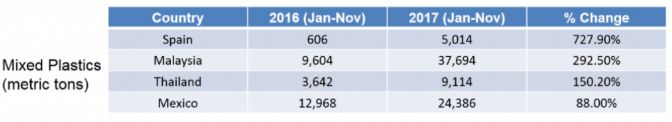 馬來西亞的混合塑料/其他塑料類產(chǎn)品出現(xiàn)大幅增長,其中進口量從2016年的9,604噸增加到2017年的37,694噸。
