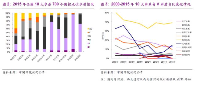 我國河流污染情況依舊嚴重,整體雖有所好轉(zhuǎn),但2011-2015年期間改善不明顯。根據(jù)2015年中國環(huán)境狀況公告顯示,長江、黃河、珠江、松花江、淮河、海河、遼河等七大流域和浙閩片河流、西北諸河、西南諸河的700個國控點位中;IV類占14.3%,V類占4.7%,劣V類占8.9%且主要集中在海河、淮河、遼河和黃河流域。海河監(jiān)控點位水質(zhì)劣V類達到39.1%,其中支流劣V占比更是高達44.0%。