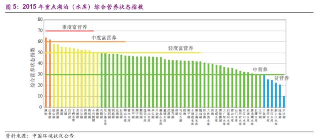 湖泊是重要的地表水資源,與人類的生活息息相關(guān),富營養(yǎng)化不可忽視。2015年,開展營養(yǎng)狀態(tài)監(jiān)測的61個湖泊(水庫)中,貧營養(yǎng)的6個;中營養(yǎng)的41個,輕度富營養(yǎng)的12個,中度富營養(yǎng)的2個。