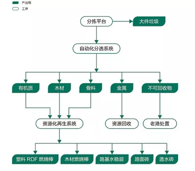 經(jīng)處理后的裝修垃圾主要分為成五大類,分別是:磚瓦等建筑廢棄物,一部分做成路基材料,一部分做成路面磚和透水磚;輕物質(zhì),塑料制品為主,可資源化利用做成塑料顆粒和RDF燃燒棒;木材,經(jīng)過(guò)加工處理變成燃燒棒;金屬物質(zhì),直接出售給資源回收企業(yè);有毒有害垃圾,移交有資質(zhì)的危費(fèi)處理企業(yè)。