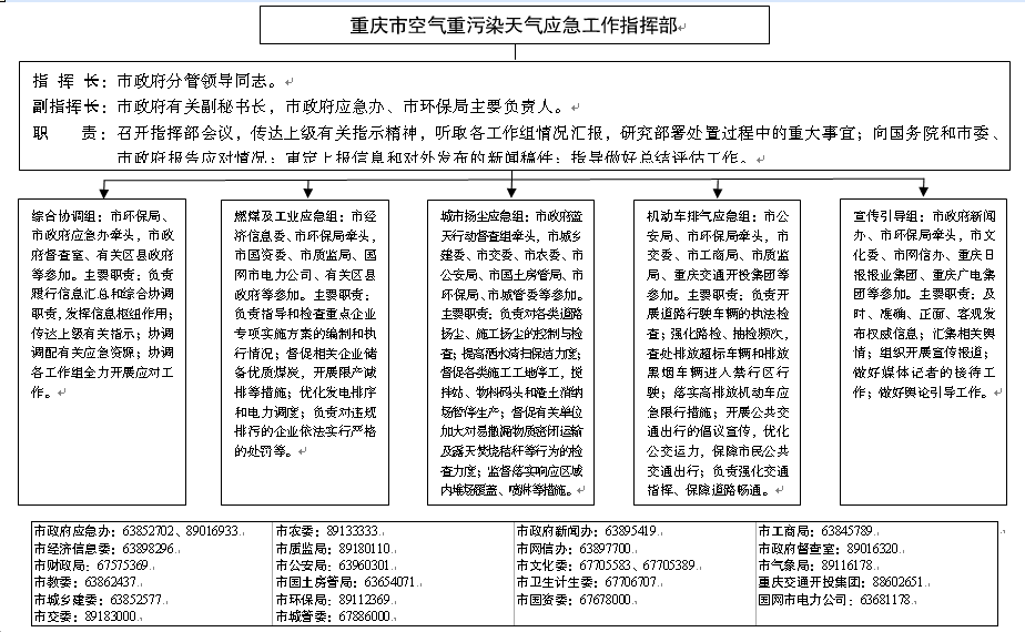 根據(jù)工作需要,在重慶市人民政府突發(fā)事件應(yīng)急委員會(huì)統(tǒng)一領(lǐng)導(dǎo)下,成立重慶市空氣重污染天氣應(yīng)急工作指揮部(以下簡(jiǎn)稱市指揮部)。市指揮部實(shí)行指揮長(zhǎng)負(fù)責(zé)制,由市政府分管領(lǐng)導(dǎo)同志擔(dān)任指揮長(zhǎng),市政府有關(guān)副秘書(shū)長(zhǎng),市政府應(yīng)急辦、市環(huán)保局主要負(fù)責(zé)人任副指揮長(zhǎng),統(tǒng)一領(lǐng)導(dǎo)和組織紅色、橙色預(yù)警空氣重污染天氣應(yīng)對(duì)工作。