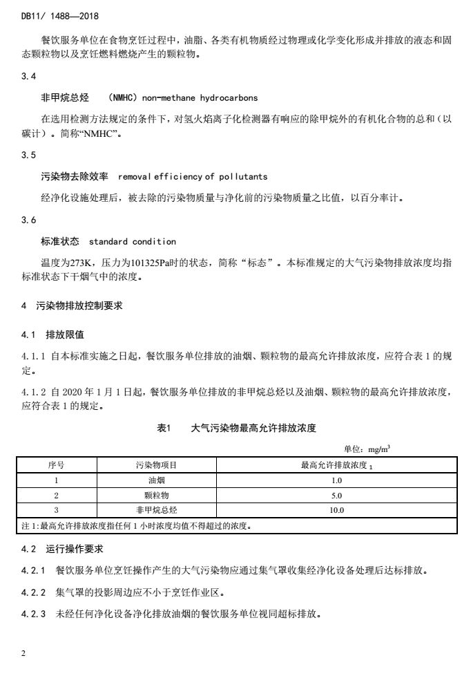 標準規(guī)定了餐飲服務(wù)單位排放的油煙、顆粒物和非甲烷總烴(注:“非甲烷總烴”為表征“揮發(fā)性有機物”,簡稱“VOCs”的一種指標)三項污染物的排放限值,明確了三項污染物的監(jiān)測要求和分析測定方法,提出了凈化設(shè)備的運行操作要求,從而全面控制餐飲業(yè)的大氣污染排放。該標準于2018年1月8日發(fā)布,并將于2019年1月1日起實施,其中油煙和顆粒物限值自標準實施之日起執(zhí)行,非甲烷總烴限值自2020年1月1日起執(zhí)行。