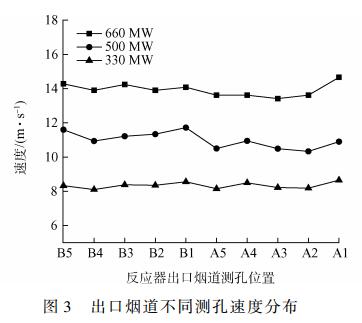 圖3為反應器出口煙道的速度場分布示意圖,從圖可知,出口煙氣流速與負荷關系密切,且與測孔位置有關。3種負荷工況下,B側速度均值分別為14.1、11.3、8.4m?s-1,A側均值分別為13.8、10.6、8.3m?s-1,均值比分別為1.02、1.07、1.00。