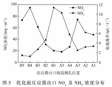 從圖5可以看出,根據(jù)出口NOx濃度和氨逃逸濃度的對應關系,NOx濃度較低的區(qū)域對應較大的噴氨量,極易產(chǎn)生較大氨逃逸濃度。B1、A5等2個測孔位置出口NOx濃度均小于20mg?m-3,其代價是很大的噴氨量和較高的氨逃逸。