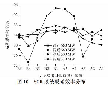 調后機組660MW負荷下,脫硝效率B側介于83.7%~85.5%,A側介于83.9%~87.1%,系統(tǒng)平均為85.0%。調后機組500MW負荷下,脫硝效率B側介于79.8%~86.1%,A側介于83.8%~86.5%,系統(tǒng)平均為84.6%。調后機組330MW負荷下,脫硝效率B側介于83.0%~87.8%,A側介于80.1%~87.0%,系統(tǒng)平均為84.4%。3種工況負荷下,系統(tǒng)總效率基本與調前持平,但效率峰谷差異大幅下降。
