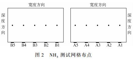 通過網(wǎng)格布點測量SCR裝置的入口及出口煙道,煙道共布置10個測孔,編號依次為B5→B1、A5→A1,其中NO、O2取樣點共選取2×5×5個(取深度方向5點均值),NH3取樣點共選取2×5×1個,具體布置如圖1所示。NO、O2經(jīng)Testo350煙氣分析儀直接測定,氨逃逸樣品采用美國EPA的CTM-027標準以化學溶液法采集,取樣時間20min。通過分析樣品溶液中的氨濃度(見圖2),并根據(jù)所采集的干態(tài)煙氣流量和O2,計算各點干基煙氣NH3濃度。