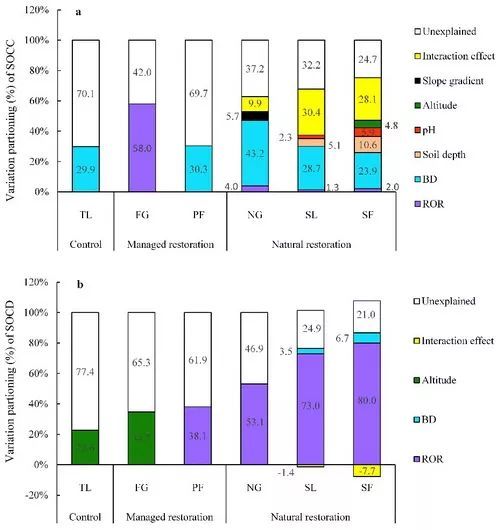 針對這一科學(xué)問題,在王克林和張偉指導(dǎo)下,研究組以耕地為對照,通過分析人工恢復(fù)方式(人工牧草、人工經(jīng)濟(jì)林)和自然恢復(fù)方式(撂荒草地、灌木林、次生林)下土壤有機(jī)碳變化特征并記錄相應(yīng)的環(huán)境因子信息,解析了不同恢復(fù)模式(人工恢復(fù)和自然恢復(fù))土壤有機(jī)碳積累變化規(guī)律,并揭示了其相應(yīng)的環(huán)境驅(qū)動因子。研究發(fā)現(xiàn),自然恢復(fù)模式土壤有機(jī)碳含量顯著高于人工恢復(fù)模式和耕地,而短期內(nèi)(9年)人工恢復(fù)模式和耕地之間有機(jī)碳含量無顯著差異。不考慮基巖出露對土壤有機(jī)碳儲量影響,各植被類型之間有機(jī)碳儲量無顯著差異,剔除基巖出露影響后,自然恢復(fù)植被下有機(jī)碳儲量顯著高于人工恢復(fù)植被和耕地。方差分解表明,人工恢復(fù)方式下土壤有機(jī)碳含量和儲量僅部分變異受環(huán)境因子(如基巖出露率、土壤容重、海拔)影響;而在自然恢復(fù)方式下,環(huán)境因子能有效解釋有機(jī)碳含量和儲量的大部分變異,且隨著植被正向演替解釋量逐漸增加,但有機(jī)碳含量和儲量的環(huán)境驅(qū)動因子并不相同,前者受多個環(huán)境因子共同驅(qū)動(如土壤容重、基巖出露率、土層深度、pH等),后者則主要受基巖出露率驅(qū)動?;趯Σ煌謴?fù)模式下有機(jī)碳含量和儲量變化分析及其環(huán)境驅(qū)動因子評估結(jié)果表明,相比人工恢復(fù)模式,短期內(nèi)自然恢復(fù)更有利于土壤碳固持,且上述環(huán)境因子可作為評估自然恢復(fù)模式下土壤碳庫變化的重要指標(biāo)。