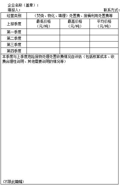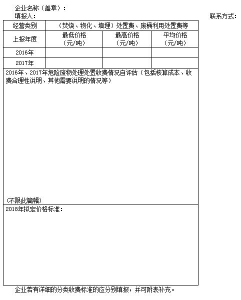 各經(jīng)營單位須按照附表1格式要求,如實(shí)填報(bào)2016、2017年危險(xiǎn)廢物處理處置收費(fèi)情況,并通過核算企業(yè)處置成本,評(píng)估分析2016年、2017年經(jīng)營價(jià)格,預(yù)報(bào)2018年經(jīng)營價(jià)格。于2018年2月7日之前報(bào)送上海市環(huán)保局,并抄送上海市固體廢物管理中心。