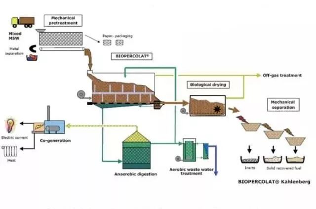 工藝全過程分為四個(gè)階段:機(jī)械預(yù)處理、淋濾處理 – 整個(gè)處理過程的核心步驟、生物干化、機(jī)械分選和 RDF 生產(chǎn)。