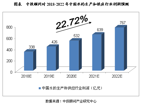 2016年1-12月,水的生產(chǎn)和供應(yīng)業(yè)利潤總額達到199.900億元,同比增長14.36%;2017年1-9月,水的生產(chǎn)和供應(yīng)業(yè)利潤總額達到194.200億元,同比增長54.74%。我們預(yù)計,2018年我國水的生產(chǎn)和供應(yīng)行業(yè)利潤將達到338億元,未來五年(2018-2022)年均復(fù)合增長率約為22.72%,2022年將達到767億元。