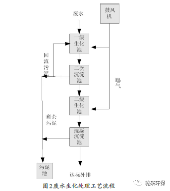 由圖2可知:通過鼓風機曝氣和生物膜的處理方法進行二次生化處理,將經(jīng)過處理后的廢水通過污水提升泵輸送到一級的生化池中,該氣浮在進水之前,需要進行二次沉淀,與回流的污泥充分的接觸,進而形成活性的污泥。污泥與污水混合后,再從曝氣的鼓風機中獲取足夠的氧(必須是溶解氧),進行硝化反應,使混合液中的可溶性有機物被具有活性的污泥吸附,從而達到微生物降解的目的,此時的化學需氧量(COD)已經(jīng)被去除75%。