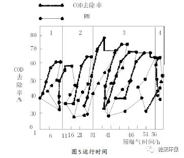 通過適量的預曝氣,能夠去除廢水中的污染物,從而提升PH值。適當?shù)目刂茀?shù)有助于難生物降解的COD轉化為易生物降解的COD,為了提高在這四個階段的COD去除效果,可以將第二階段的運行時間加長,如圖5所示。