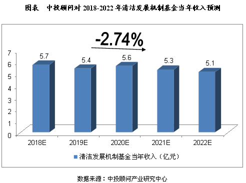 2016年,清潔發(fā)展機制基金當年收入為6.27億元,同比減少0.56億元。我們預(yù)計,2018年清潔發(fā)展機制基金當年收入將達到5.7億元,未來五年(2018-2022)年均復合增長率約為-2.74%,2022年清潔發(fā)展機制基金當年收入將達到5.1億元。