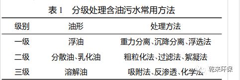 在油田采油污水中,根據(jù)原油粒徑的不同分為四種油形。中國(guó)大多數(shù)油田常采用一級(jí)處理也就是 預(yù)處理去除浮油,二級(jí)處理來(lái)破乳和去除分散油,深 度處理主要是除掉溶解油。富含不同油形含油污水 常用處理方法具體見(jiàn)表 2。