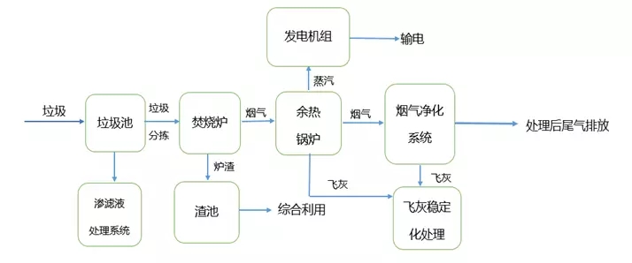 一般而言,不同生活垃圾焚燒廠、不同企業(yè)、不同研究機構(gòu)開發(fā)的生活垃圾焚燒技術(shù)與城市生活垃圾焚燒工藝流程不盡相同。圖7為城市生活垃圾焚燒發(fā)電系統(tǒng)的一般工藝流程。