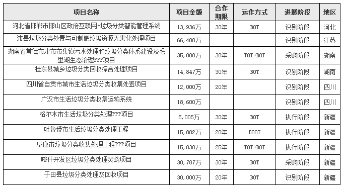 根據(jù)財(cái)政部入庫項(xiàng)目不完全統(tǒng)計(jì),涉及垃圾分類的PPP項(xiàng)目如下: