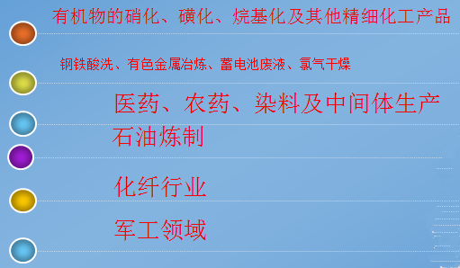 有機(jī)化工產(chǎn)品如檸檬酸、氨基磺酸、草酸、硫酸二甲酸、合成甲酚、十二烷基苯磺酸等產(chǎn)品及磺化、硝化、烷基化、酯化等化學(xué)反應(yīng)單元,這些反應(yīng)廣泛用于農(nóng)藥、醫(yī)藥、染料、香料等行業(yè)生產(chǎn),都大量用到硫酸。每年應(yīng)用于有機(jī)化工產(chǎn)品的硫酸在1000-1500萬(wàn)噸,其中有參與化學(xué)反應(yīng),同時(shí)產(chǎn)生大量20-60%的廢硫酸,保守統(tǒng)計(jì),應(yīng)該在2000萬(wàn)噸以上部分。