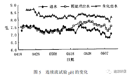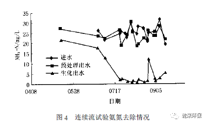 2. 4. 2 氨氮的去除:從圖4 可知,在6 月24 日之前,系統(tǒng)幾乎沒(méi)有去除氨氮的效果,且經(jīng)常出現(xiàn)出水氨氮略高于進(jìn)水的情況。為了強(qiáng)化硝化效果,24 日起將生化段的停留時(shí)間從12H延長(zhǎng)至16H 。改變系統(tǒng)后的第一個(gè)星期情況沒(méi)有什么變化,從7 月2 日開(kāi)始明顯出現(xiàn)了生物脫氮的跡象,到了7 月10 日,生物脫氮效果明顯,出水氨氮小于5 mg/L。7 月23 日后達(dá)到了很好的生物硝化效果。此后氨氮的平均出水濃度只有2. 9 mg/L,去除率達(dá)88. 8 % 。