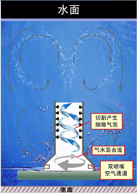 旋流曝氣器在工作過程中,氣體從底部法蘭口進(jìn)入后從緊貼鐘型曲面的 2 個(gè)噴嘴噴出形成旋流效果,以極快的速度沿著鐘型壁面向上加速回旋。由于鐘型上側(cè)漸漸狹窄,空氣獲得極大的加速度和沖擊力。 由于氣體作用,混合液在筒內(nèi)、外循環(huán)流動(dòng),氣液上升過程中,被筒內(nèi)部結(jié)構(gòu)多次碰撞切割,形成大量超微氣泡,且與周圍的泥水混合物充分混合,增加了氧氣的傳質(zhì)速率和氧利用率;充分混合的氣水猛力向上沖出,強(qiáng)烈的循環(huán)水流使部分小氣泡和水流返回池底,同時(shí)使底部淤泥參與循環(huán),因而整個(gè)曝氣池內(nèi)無充氧盲區(qū),實(shí)現(xiàn)了曝氣池容積利用最大化。(見圖3)
