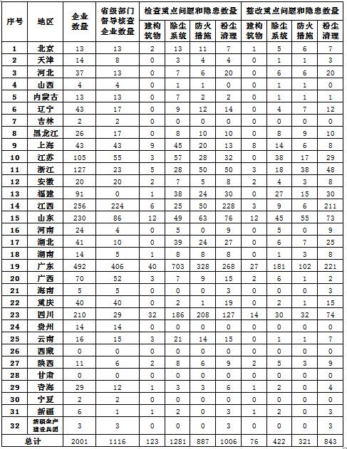 (三)責(zé)任落實(shí)層面,整治部署要求落實(shí)不到位,跟蹤督辦力度不夠,整治工作還沒(méi)有閉環(huán)。一是執(zhí)法檢查不夠嚴(yán)格。一些地區(qū)存在重檢查輕整改、只檢查不執(zhí)法、以隨機(jī)抽查代替集中整治的問(wèn)題。從各地報(bào)送的調(diào)度表看,一些地區(qū)落實(shí)整治要求不到位,取締關(guān)閉、停產(chǎn)整頓的企業(yè)很少,有的地區(qū)甚至限期整改企業(yè)數(shù)為零,此類(lèi)問(wèn)題在河北、吉林、廣西等?。▍^(qū))的部分地區(qū)比較突出。二是沒(méi)有按要求調(diào)度通報(bào)工作進(jìn)展。有的地區(qū)沒(méi)有將國(guó)家安全監(jiān)管總局明查暗訪通報(bào)的要求落實(shí)到位,有的地區(qū)一轉(zhuǎn)了之,沒(méi)有“對(duì)號(hào)入座”、舉一反三。部分地區(qū)沒(méi)有按要求定期調(diào)度轄區(qū)工作信息,有的沒(méi)有印發(fā)通報(bào)或僅是“點(diǎn)對(duì)點(diǎn)”通報(bào),有的通報(bào)指出問(wèn)題時(shí)大而化之,不明確、不具體。三是省級(jí)安全監(jiān)管部門(mén)對(duì)作業(yè)場(chǎng)所30人及以上企業(yè)的督導(dǎo)核查不到位。經(jīng)統(tǒng)計(jì)匯總各地區(qū)調(diào)度表,全國(guó)共有作業(yè)場(chǎng)所30人及以上金屬粉塵、木粉塵企業(yè)2001家,各省級(jí)安全監(jiān)管部門(mén)已經(jīng)組織督導(dǎo)核查的共計(jì)1116家,河北、遼寧、浙江、福建、山東、河南、湖北、湖南、四川、青海、新疆等地區(qū),督導(dǎo)核查的企業(yè)數(shù)量沒(méi)超過(guò)半數(shù)。四是報(bào)送的調(diào)度報(bào)表填寫(xiě)不規(guī)范、不準(zhǔn)確、不真實(shí)。專(zhuān)項(xiàng)整治的3個(gè)調(diào)度表是體現(xiàn)工作進(jìn)展和不斷深化整治的重要依據(jù),一些地區(qū)基層部門(mén)沒(méi)有認(rèn)真填寫(xiě),省級(jí)部門(mén)沒(méi)有認(rèn)真分析、審核,存在錯(cuò)項(xiàng)漏項(xiàng)或不合邏輯的信息。部分地區(qū)“未完成‘十大重點(diǎn)問(wèn)題和隱患’整改的企業(yè)數(shù)量”占本地區(qū)粉塵涉爆企業(yè)總數(shù)比例過(guò)低、甚至為零,需要認(rèn)真核實(shí)數(shù)據(jù)的準(zhǔn)確性。具體情況見(jiàn)《2017年粉塵防爆專(zhuān)項(xiàng)整治情況匯總表》(附件1)。