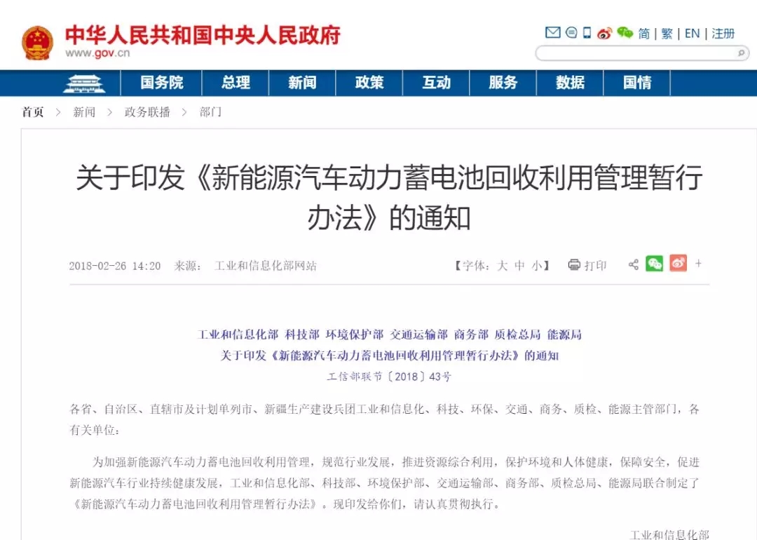 2月26日,工業(yè)和信息化部、科技部、環(huán)境保護(hù)部、交通運(yùn)輸部、商務(wù)部、質(zhì)檢總局、能源局印發(fā)《新能源汽車(chē)動(dòng)力蓄電池回收利用管理暫行辦法》的通知,旨在加強(qiáng)新能源汽車(chē)動(dòng)力蓄電池回收利用管理,規(guī)范行業(yè)發(fā)展。