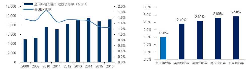 我國環(huán)境治理標準距國際先進標準差距大,我國環(huán)保污染治理投資總額占GDP比重為1.3%,與發(fā)達國家同期2.5%的投入還有較大差距。