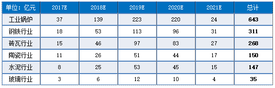 假設到2021 年底,全國所有地區(qū)非電行業(yè)均達到特別排放限值的要求,測算出以下幾個業(yè)大氣治理需求。