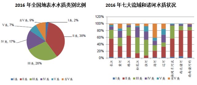 根據(jù)《2016年環(huán)境狀況公報》公布的數(shù)據(jù),地表水方面,1940個國考斷面中,劣Ⅴ類水占比8.6%,Ⅳ、Ⅴ類水累計占比23.7%,水質(zhì)堪憂,且我國水資源分布不均衡,北方呈現(xiàn)生態(tài)型缺水疊加污染性缺水。2015年3月國務院出臺水十條,確立的目標是到2020年,全國水環(huán)境質(zhì)量得到階段性改善,京津冀、長三角、珠三角等區(qū)域水生態(tài)環(huán)境狀況有所好轉(zhuǎn)。
