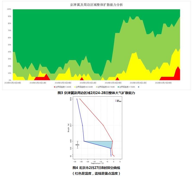 地基雷達觀測結(jié)果也顯示,京津冀及周邊地區(qū)大氣邊界層高度從2月25日以來總體持續(xù)下降,26日0時到27日0時邊界層高度低于700米的區(qū)域占比超過60-80%,邊界層高度低于500米的區(qū)域占比達10-30%,不利于大氣污染物擴散(圖3)。北京探空資料顯示27日8時1400米以下有逆溫層,抑制污染物垂直擴散。長時間的小風、高濕疊加逆溫等不利氣象條件,導(dǎo)致污染不斷積累和二次轉(zhuǎn)化(圖4)。
