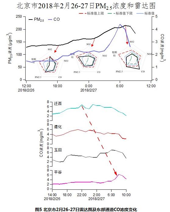 本次重污染過程中,從唐山到北京一線的CO濃度伴隨PM2.5存在明顯的快速增加,北京2月27日4時之前CO維持在2.2-2.3mg/m3,5-9時迅速上升至2.6-4.4mg/m3。從遷西-遵化-玉田-平谷(沿主導(dǎo)風向)各監(jiān)測點位的時序變化也可以看出,CO沿傳輸方向峰值明顯呈依次出現(xiàn)的特征。污染物特征雷達圖也顯示,北京在此次污染過程中CO呈現(xiàn)相對很高的特征。以上證據(jù)表明,北京市的污染明顯受到了來自東部地區(qū)的傳輸影響(圖5)。