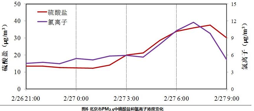 同時,26日夜間北京市PM2.5中硫酸鹽組分濃度快速上升,27日早晨硫酸鹽質(zhì)量濃度高達約40微克/立方米,占PM2.5總質(zhì)量的20%左右,氯離子濃度也呈現(xiàn)同步增長趨勢,結(jié)合上述分析,指示了區(qū)域燃煤污染傳輸?shù)挠绊?;再疊加本地機動車等污染源排放的累積,北京市PM2.5濃度快速上升,在27日凌晨至上午達到重污染水平(圖6)。